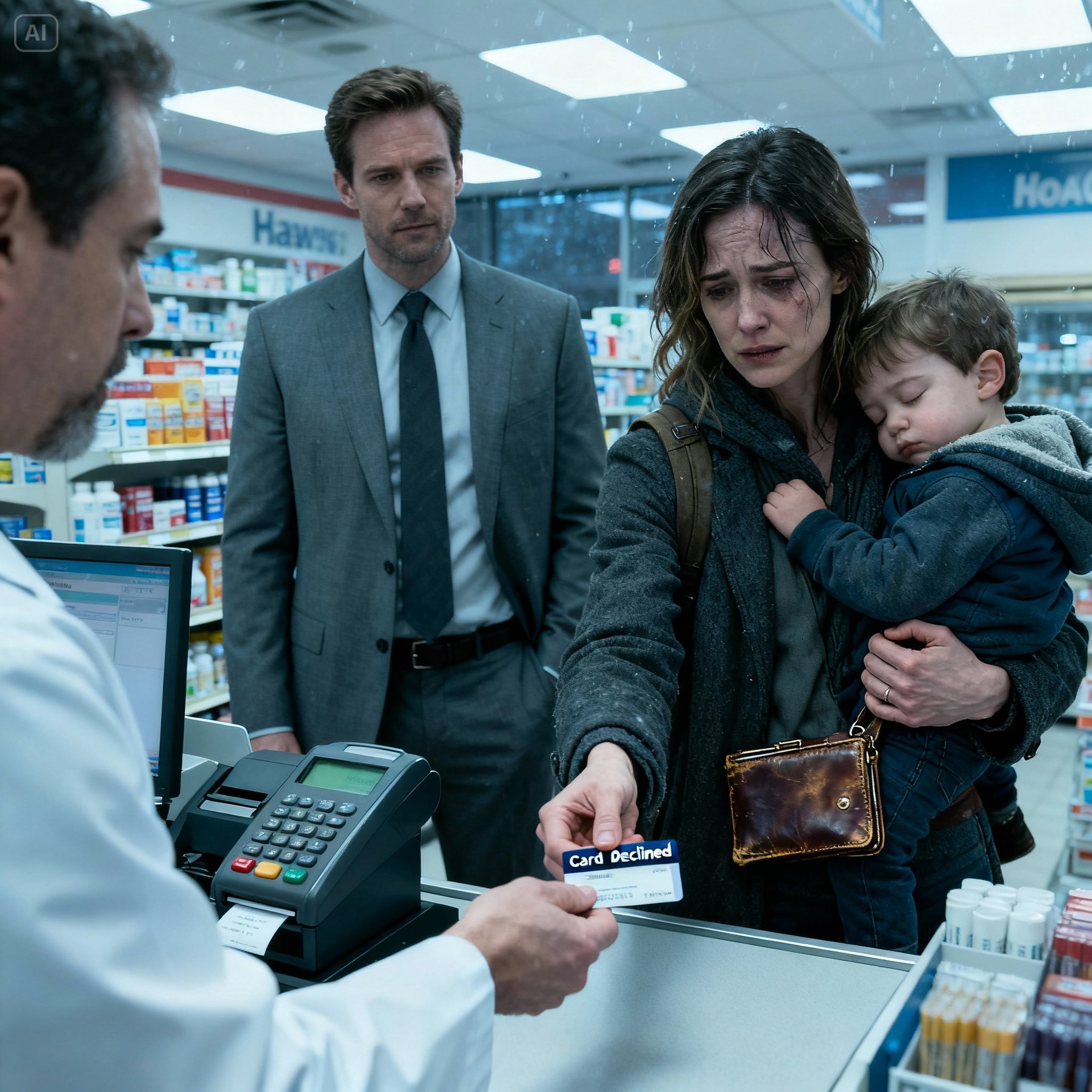 Clara ficou parada, os olhos vidrados, mas secos. Ela já havia tentado dois cartões; um estava no limite, o outro, vazio. Ela sentiu os olhares das pessoas atrás dela na fila, julgamentos silenciosos pressionando suas costas como um peso que ela não podia mais carregar. A voz da farmacêutica suavizou. “Talvez tente outro cartão, senhora”, disse ela gentilmente, olhando para Ethan, cuja cabeça repousava no ombro da mãe.
