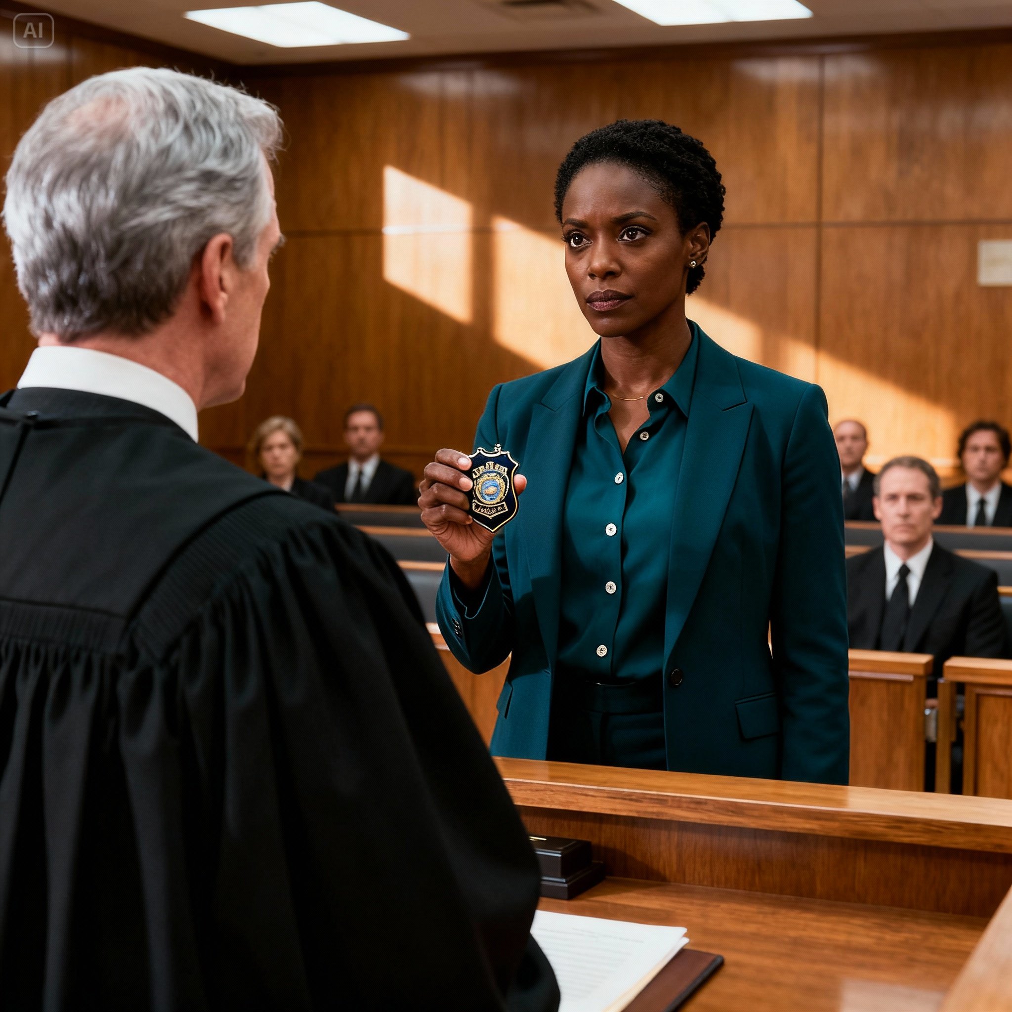 O rosto do juiz empalideceu. Ele olhou para o distintivo, depois para Lacy, como se tentasse reconciliar a mulher composta à sua frente com a agente federal que ela afirmava ser. Os murmúrios na galeria aumentaram, uma onda de choque e admiração.