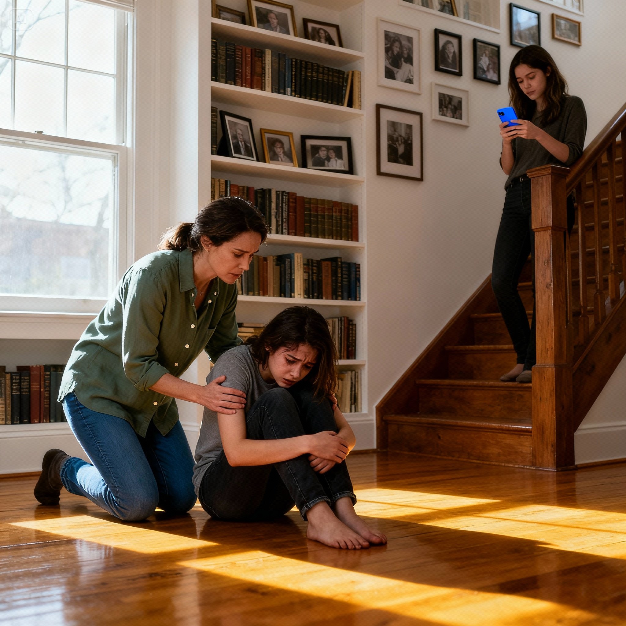 “Ela é nosso bebê,” minha mãe sussurrou, as lágrimas agora escorrendo livremente. “Ela é tão… sensível. Elas só… elas brincam de forma bruta. Rivalidade de irmãs. É normal.”