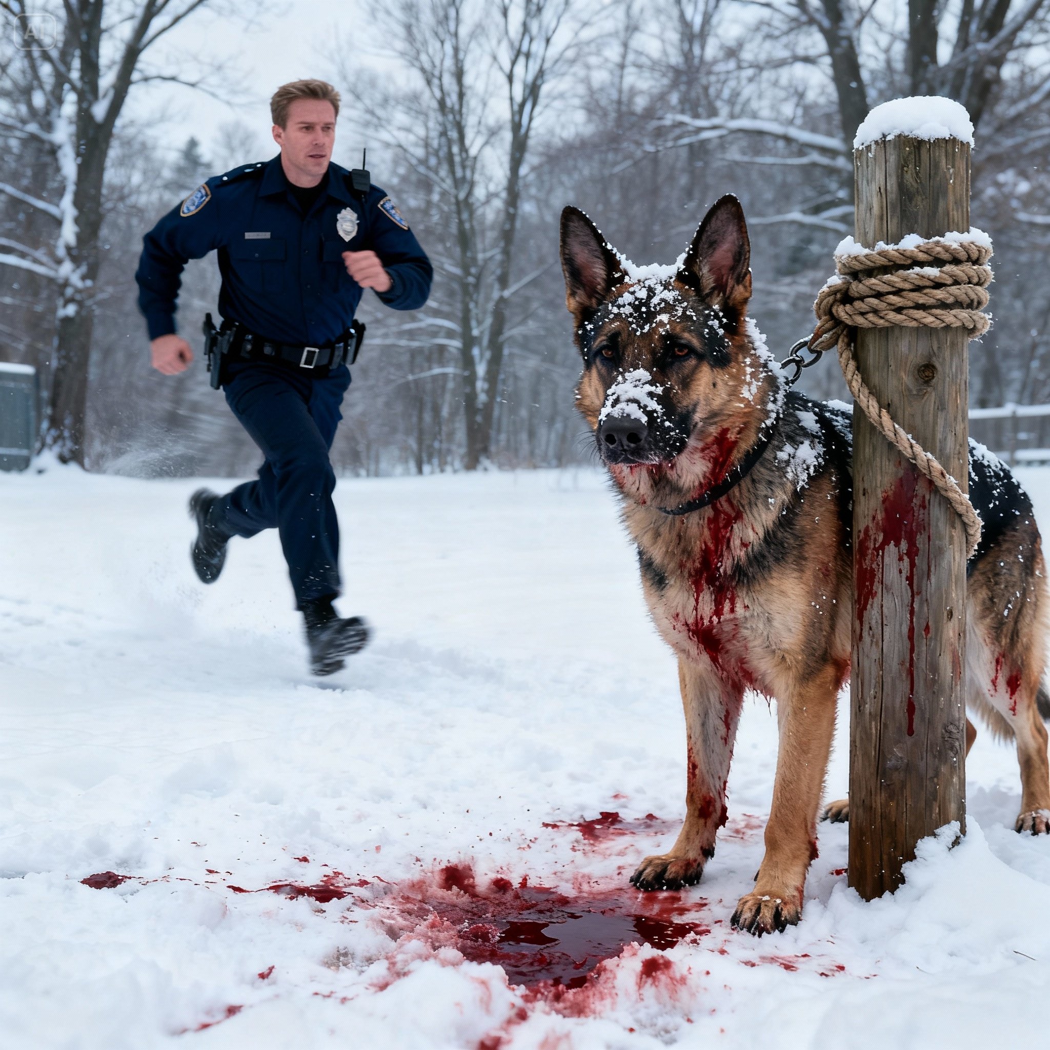 Lá, na borda de uma cerca de arame rompida, uma Pastora Alemã estava amarrada a um poste de metal enferrujado. Um cabo de aço mordia profundamente seu pescoço, incrustado de sangue congelado. Seu pelo estava encharcado, cheio de pedaços de gelo.