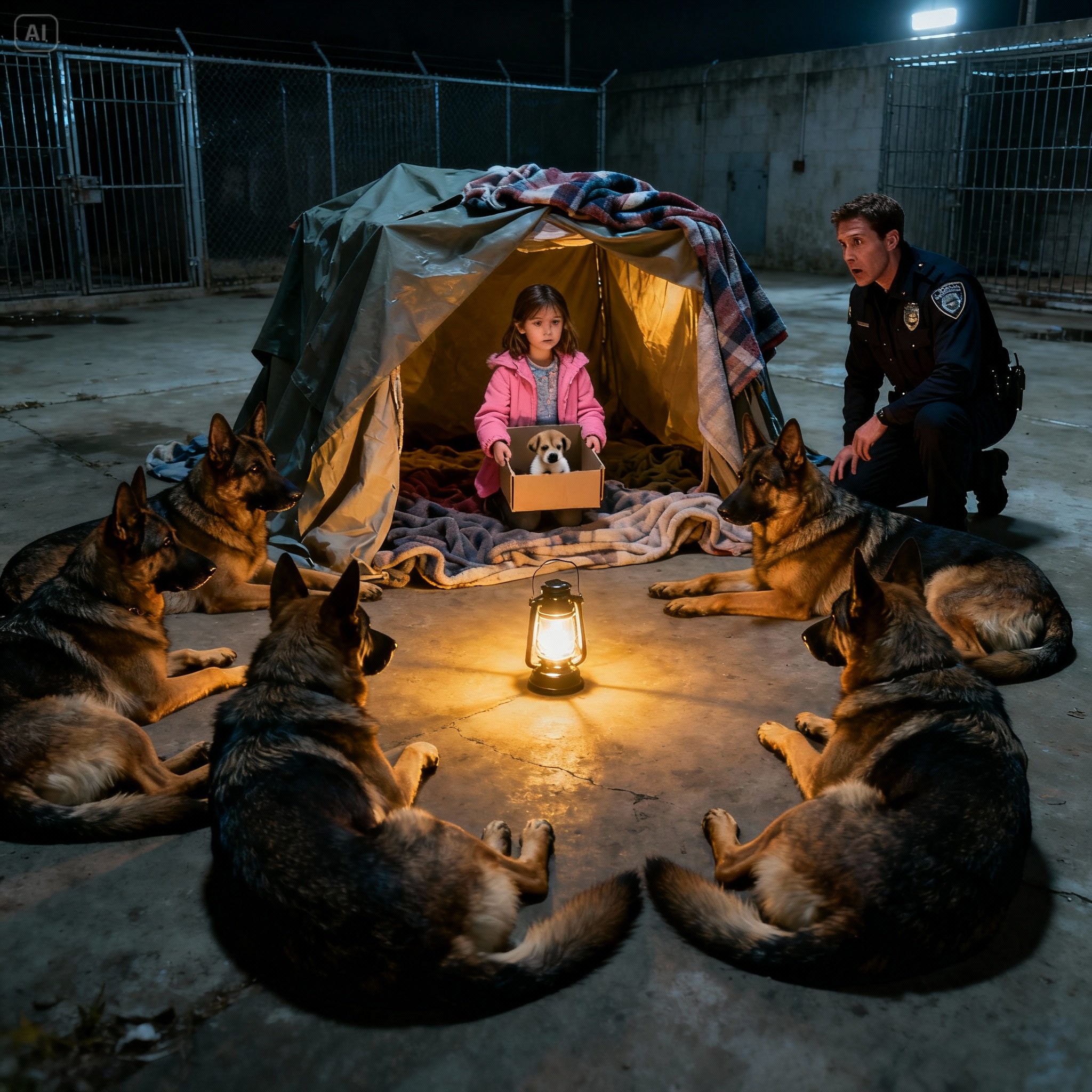 No quintal dos fundos, entre os canis de concreto vazios, eles a encontraram. Os seis pastores alemães estavam deitados em um círculo protetor ao redor de um elaborado “forte” de cobertores, construído dentro de um dos canis.